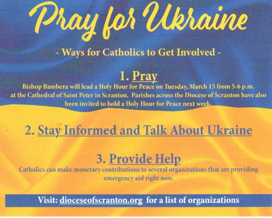 Holy Hour for Peace for Ukraine, St. Mary Magdalen Church, Sunday, March 13, 4 P.M. Posted by honesdalecatholic 0 Share this: Click to share on X (Opens in new window) X Click to share on Facebook (Opens in new window) Facebook Click to email a link to a friend (Opens in new window) Email Click to print (Opens in new window) Print Like Loading... Related