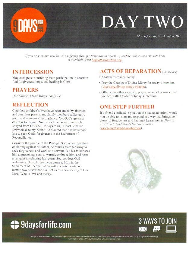 9 Days for Life Novena – Day 2 Posted by honesdalecatholic 0 Share this: Click to share on X (Opens in new window) X Click to share on Facebook (Opens in new window) Facebook Click to email a link to a friend (Opens in new window) Email Click to print (Opens in new window) Print Like Loading... Related