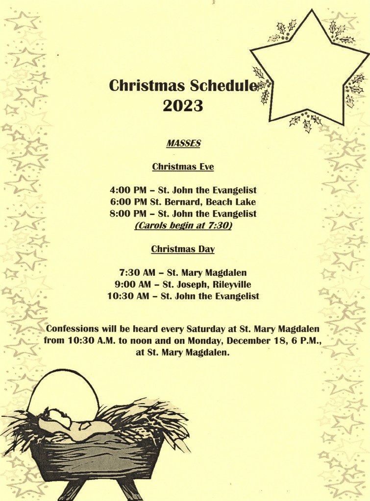 Christmas Mass Schedule-St. John the Evangelist Posted by cantor53 0 Share this: Click to share on X (Opens in new window) X Click to share on Facebook (Opens in new window) Facebook Click to email a link to a friend (Opens in new window) Email Click to print (Opens in new window) Print Like Loading... Related