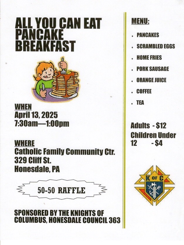 Knights of Columbus “All You Can Eat Pancake Breakfast-April 13 Posted by cantor53 0 Share this: Click to share on X (Opens in new window) X Click to share on Facebook (Opens in new window) Facebook Click to email a link to a friend (Opens in new window) Email Click to print (Opens in new window) Print Like Loading... Related