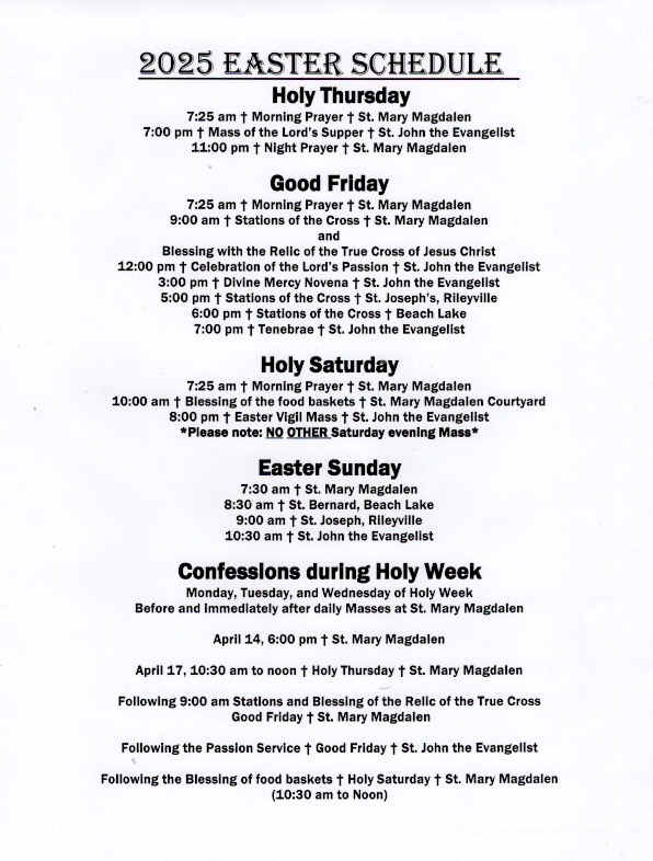 Easter Schedule for St. John the Evangelist Parish Posted by cantor53 0 Share this: Click to share on X (Opens in new window) X Click to share on Facebook (Opens in new window) Facebook Click to email a link to a friend (Opens in new window) Email Click to print (Opens in new window) Print Like Loading... Related